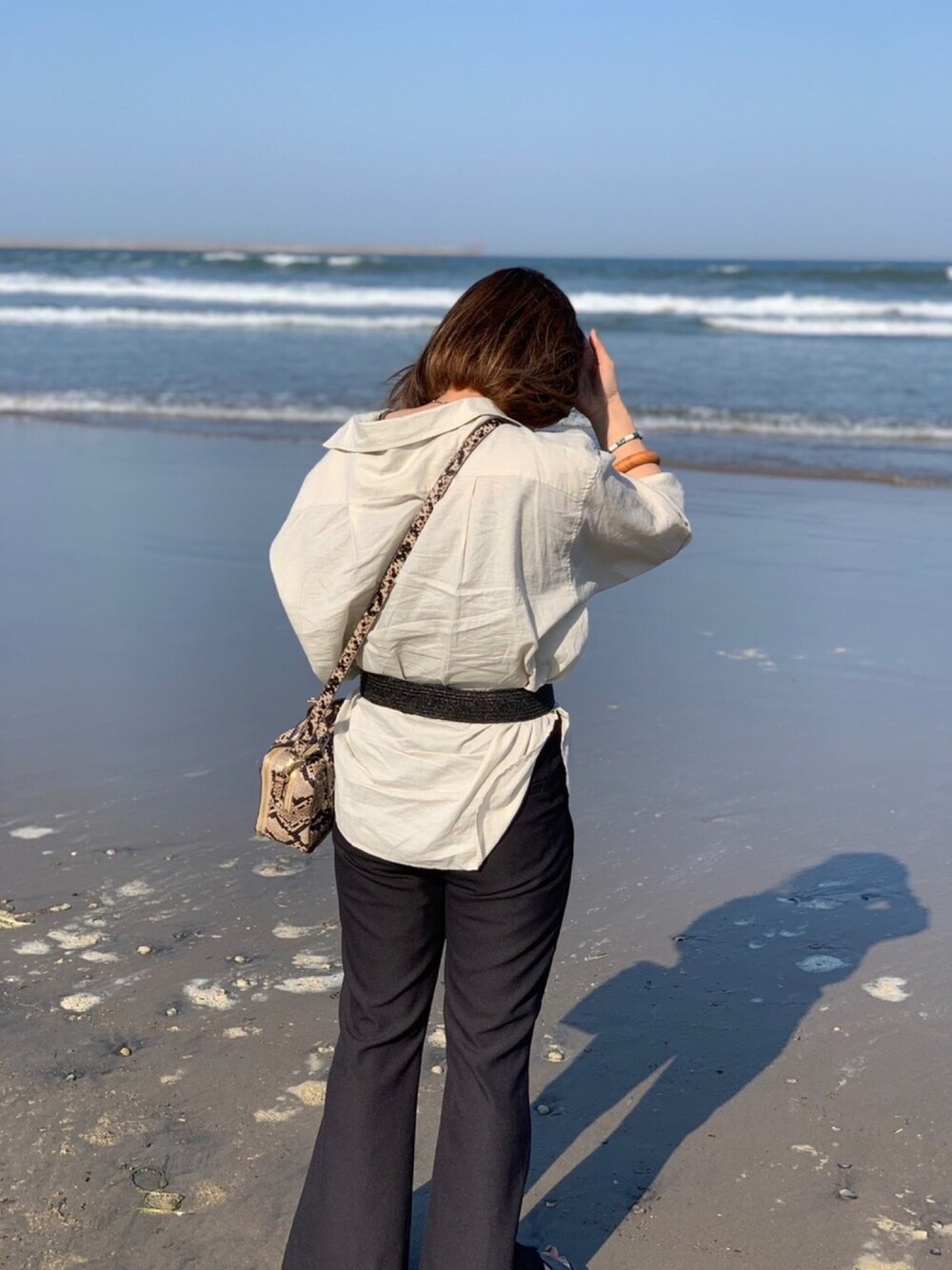 雑材太ベルトで締めて シンプルな色味だからパイソンで一点投入❣️ 海涼しかった🏖