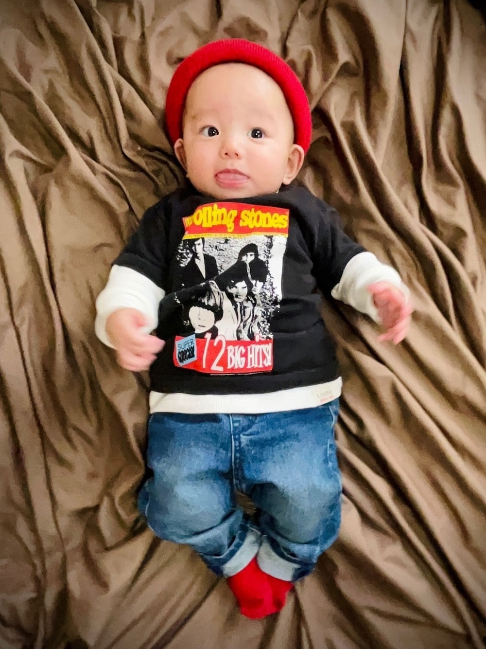ベビーロック🎸コーデ2 ▸100均ニット帽 ▸H&MバンドTシャツ ▸ワッフル素材インナー ▸H&Mデニム ▸西松屋靴下 このバンドT小さくなっちゃった😂夏はもうつけれないな〜😭