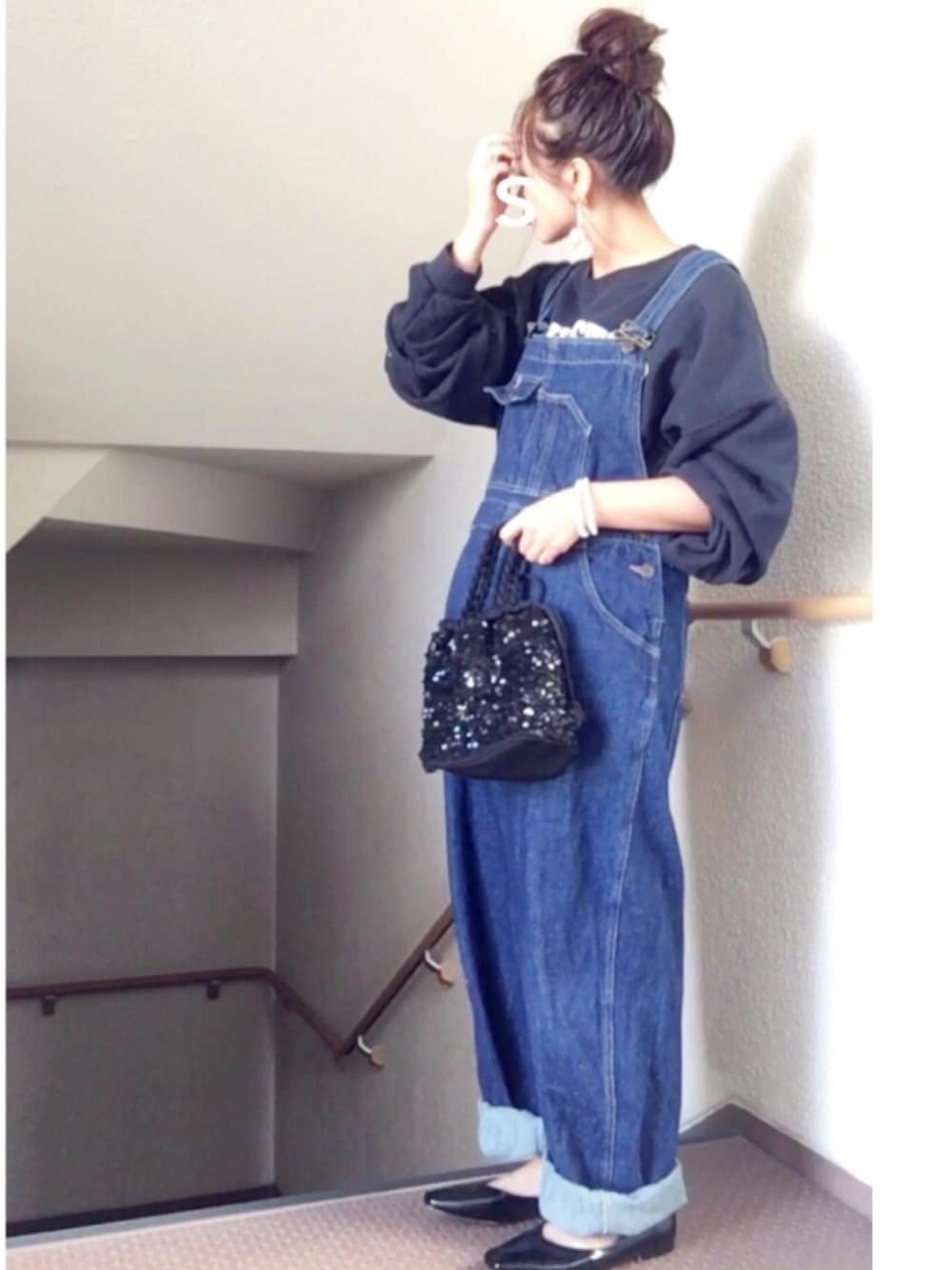 光で見えてないけど パールの2連ブレスレット◯ スウェット☺︎used オーバーオール☺︎used カバン☺︎used