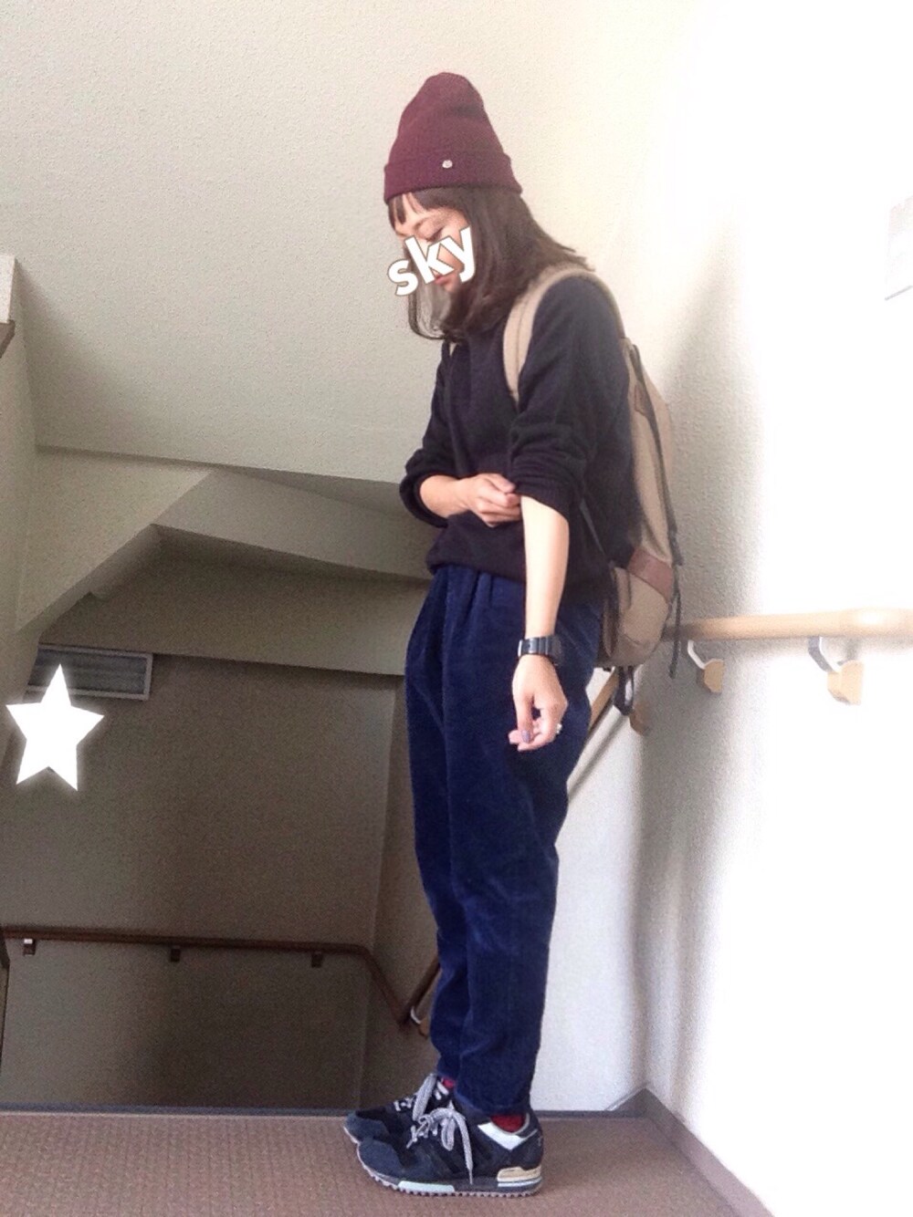 ☺︎*♡ クロ×ネイビー 伝わらなくて申し訳ないけど パンツのシルエットかわいい。 全体暗くなりすぎないように リュックあえてベージュ♡ と、ちらほら ボルドー☺︎ ニット☺︎GU カバン☺︎パタゴニア 中に着込んでるので 寒くはないです☃。