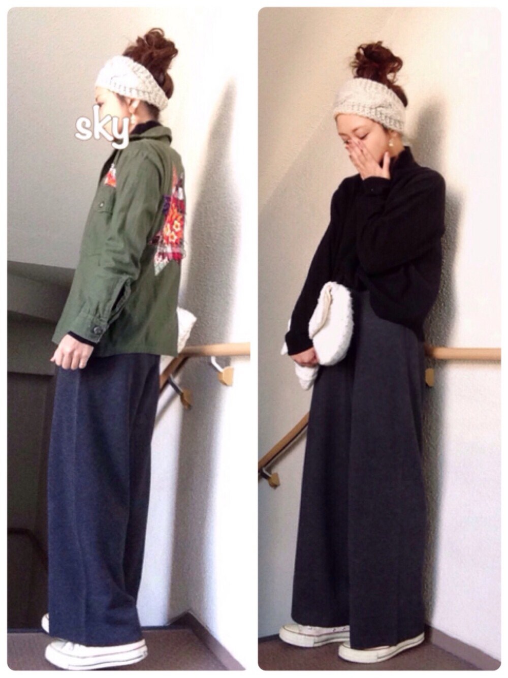 ☺︎*♡ アウター代わりに羽織った リメイクシャツ以外が ニット素材。 静電気がすごい♡ ニット☺︎GU パンツ☺︎niko and… 靴☺︎コンバース ミリタリーに あえてのパールアクセ♡