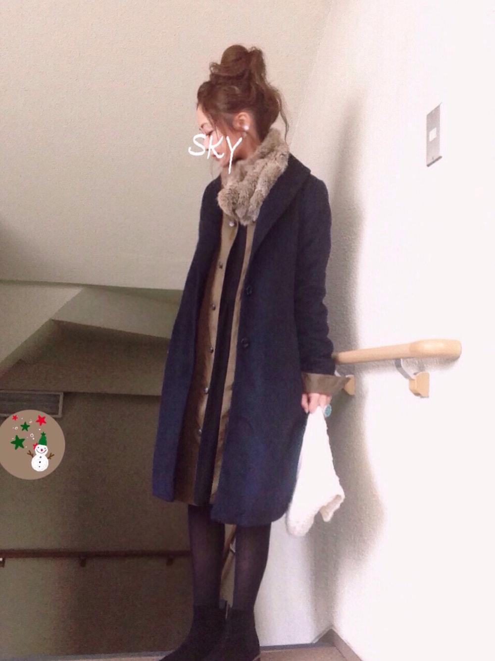 ☺︎*♡ いつものコーデに合わせるマフラーを ファーに変えたら お出かけっぽくなりました*☺︎ ロングのミリシャツに ファー合わせたかっただけなんですけど☺︎ あとはクロ。 コートまでくろいと なんか怖かったのでネイビー♡ 🎅🎂 カバンチョイスミス。 でも髪の毛うまくできたから 良しとします♡