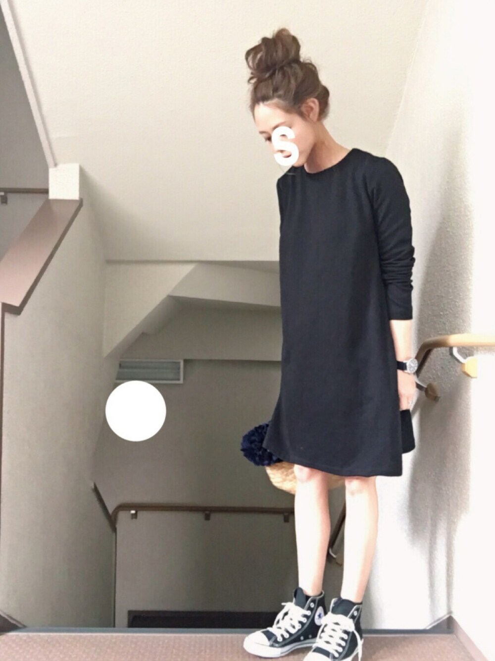 ☺︎*♡ クロ。 カゴバッグもちたかったので フリルと時計だけネイビー♫ ワンピース☺︎GU 靴☺︎コンバース