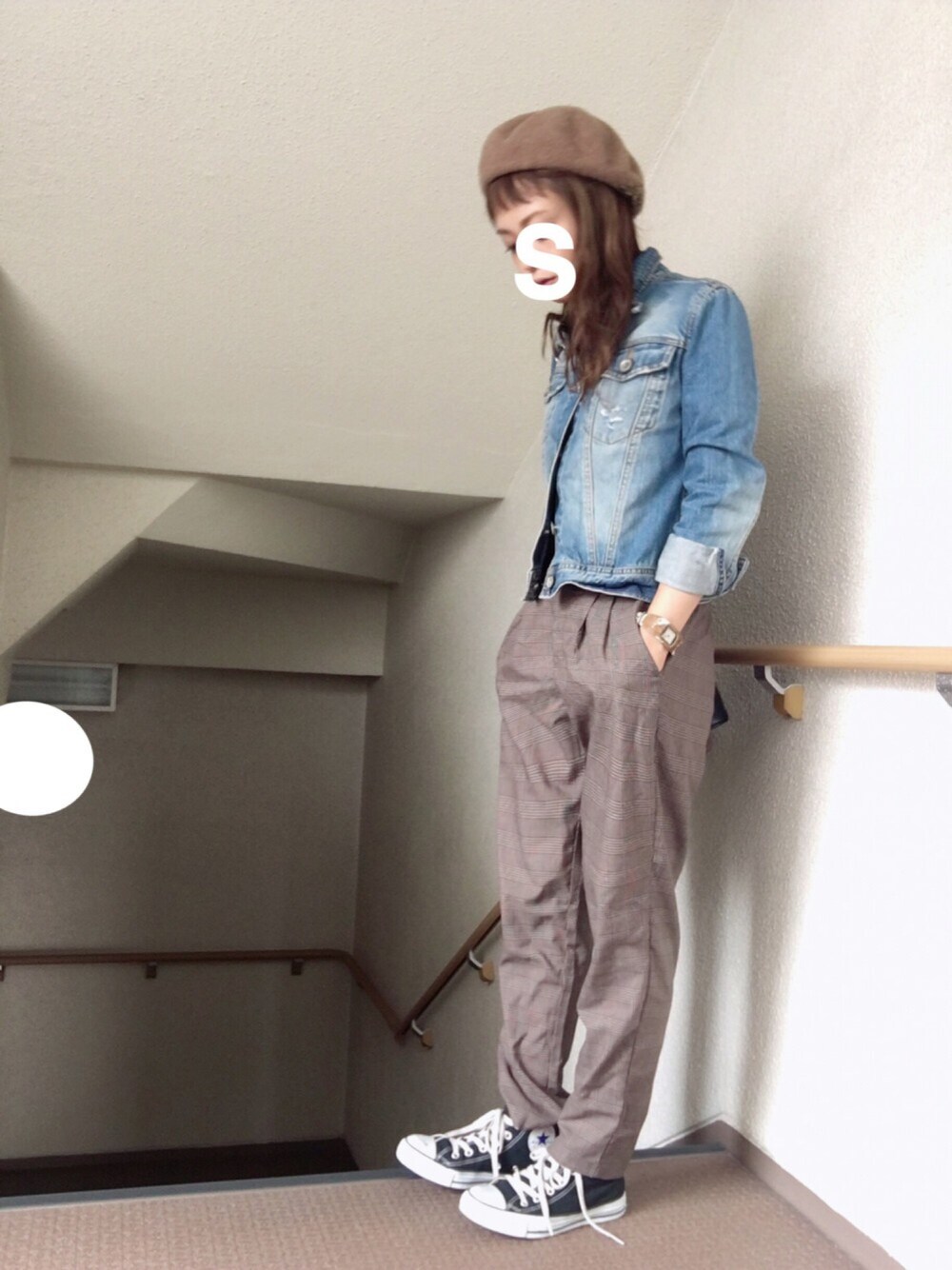 ☺︎*♡ チャイロ × クロ 見えにくいけど パンツチェック柄です◎ 形がかわいい♡ので 今日も トップス小さくしました Tシャツ☺︎ungrid パンツ☺︎GU 去年の アウター☺︎古着 靴☺︎コンバース ちゃんと靴ひも 結び直しました◎