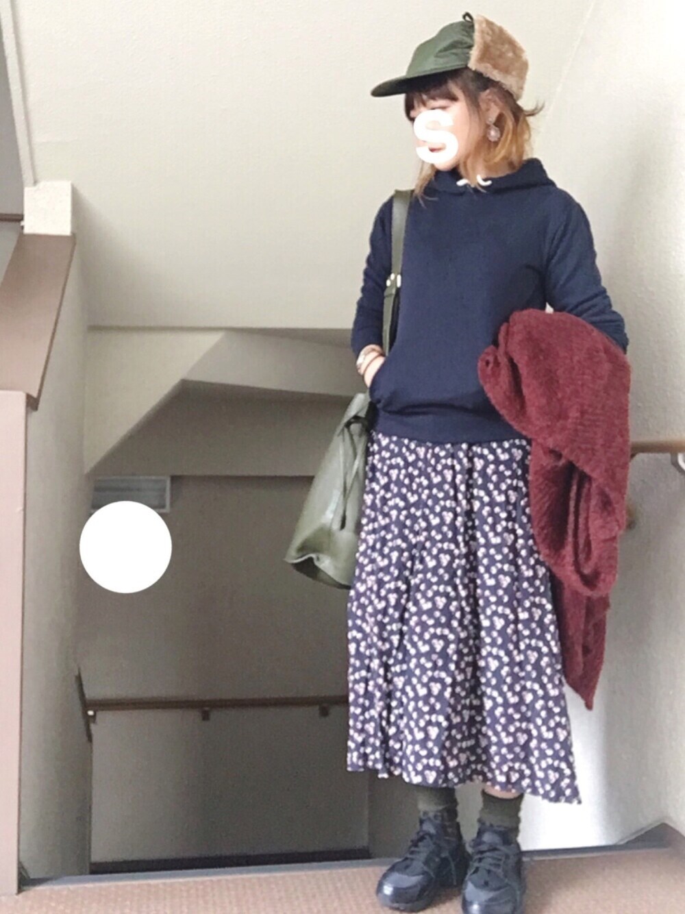 ☺︎*♡ ワンピース × スウェット 気温高くて 中に着込めば アウター要らないくらいでした◎ 気温差に備えて 小花柄から ワインレッドのロングカーディガン◎ くつ下に合わせて 他の小物も カーキ ○ 地味なクリスマスカラー ワンピース☺︎kastane スウェット☺︎チャンピオン 靴☺︎NIKE カバン☺︎KBF カーディガン☺︎KBF このくつ下 めっちゃ暖かい♡