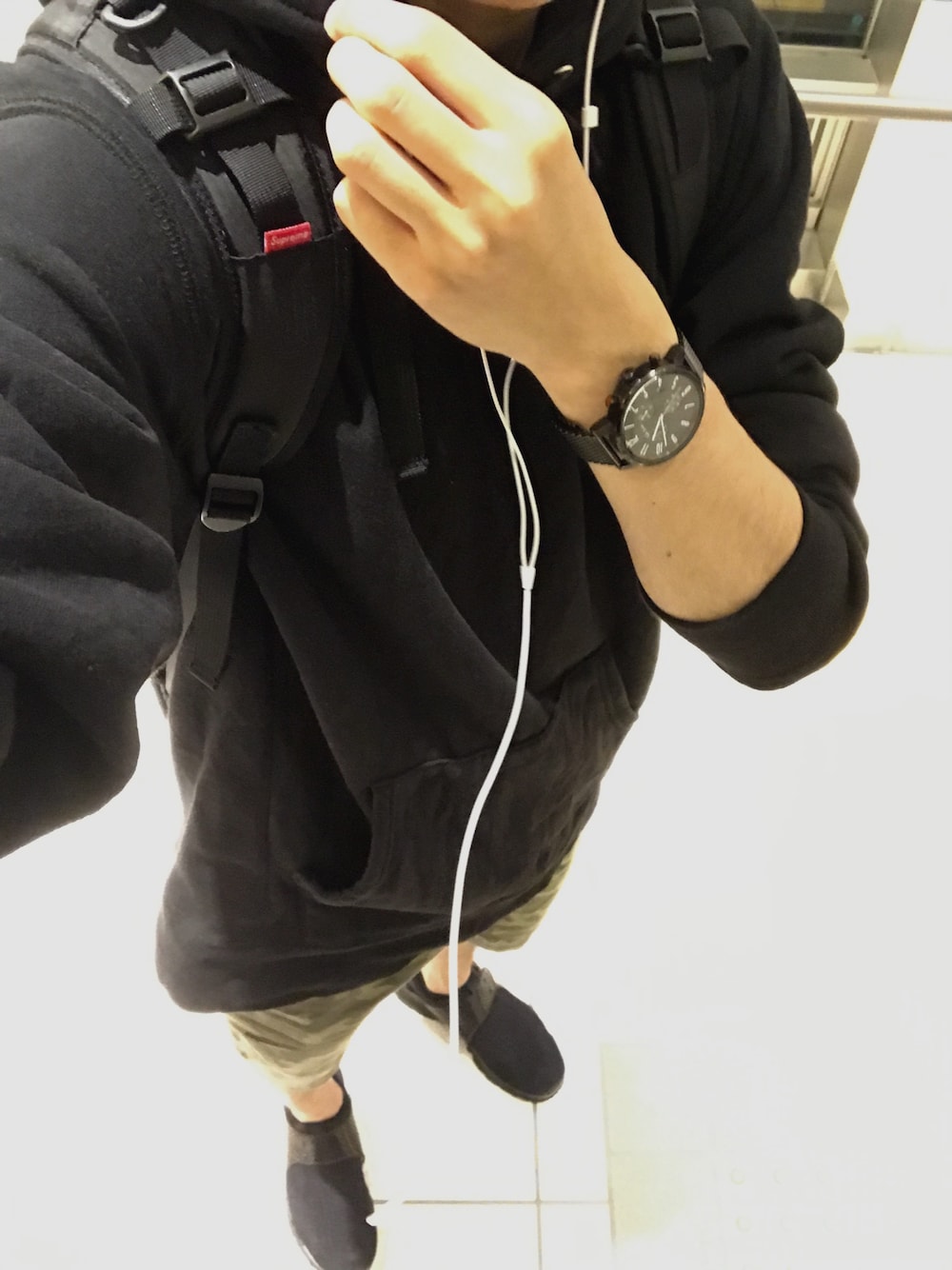 tops:supreme(black)L pants:不明(camouflage)M shoes:NIKE(black)28cm watch:Paul Smith(black) backpack:supreme(black)