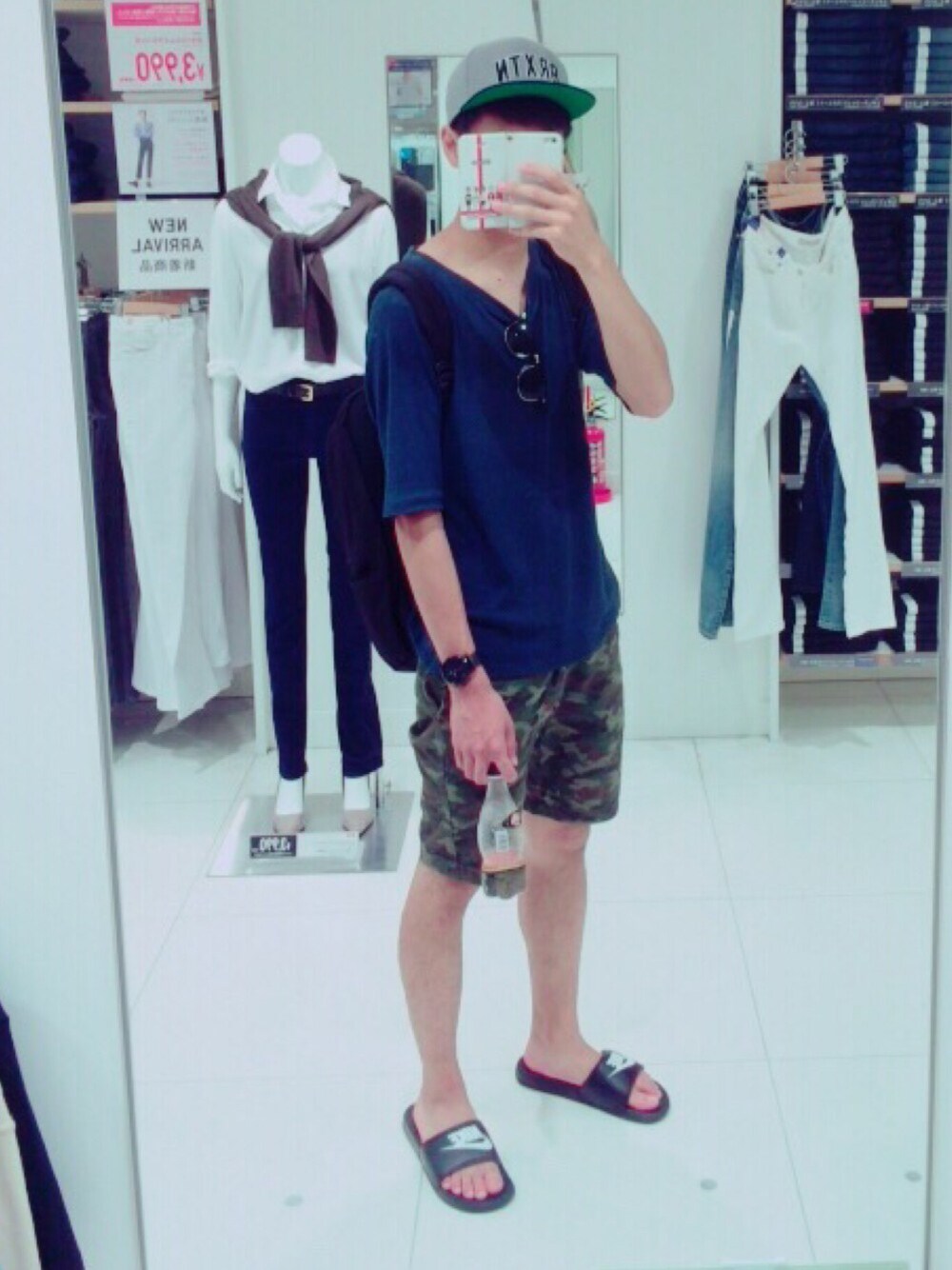 T-shirt:不明(navy) pants:Right-on(camouflage)M shoes:NIKE(black)27cm backpack:Mnhatton Portage(black) watch:PaulSmith(black) sunglasses:不明 cap:BRIXTON(gray)