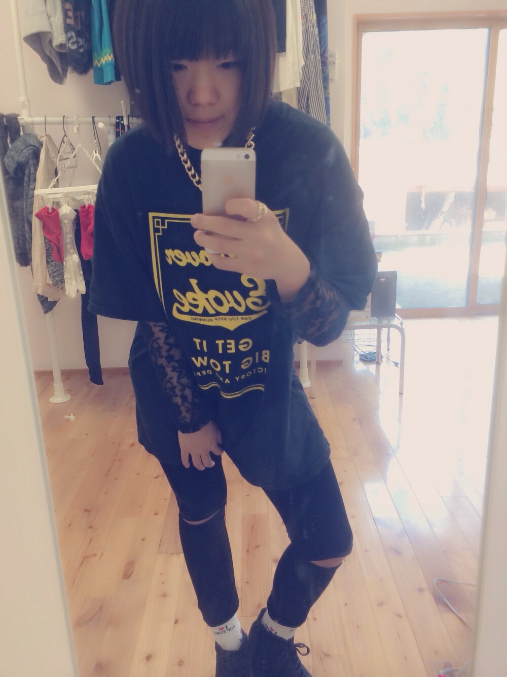 mensのTシャツでコーデを組んでみました。 古着です。ゴールドアクセでポイントを。
