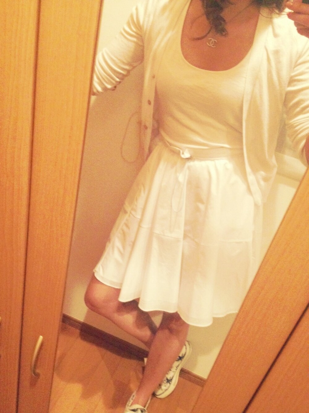膝丈フレアにスニーカー。