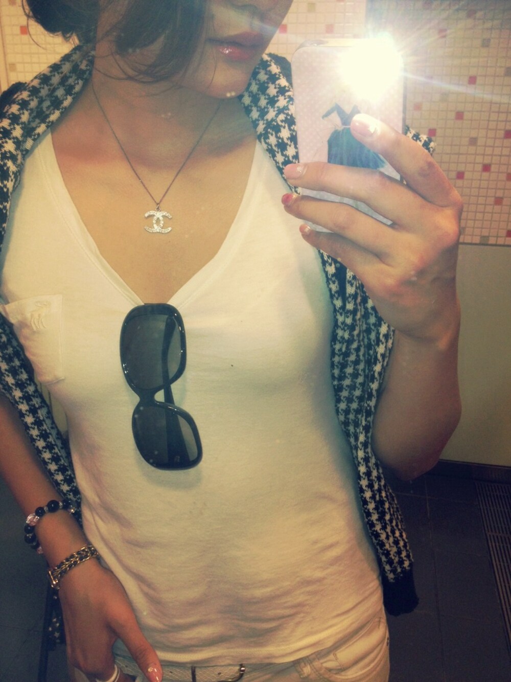 オールホワイトに柄ニット肩がけ。 春だからニットがどこかにあるとまだ夏感がでなくていいかんじの抑えめに。 髪はゆるめにアップ。