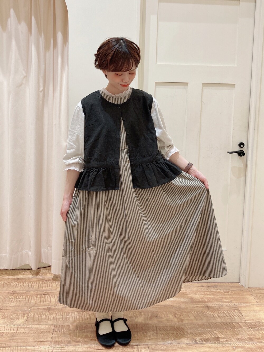 モノトーンでまとめたコーディネートは大人も楽しめるガーリースタイルです! 前後着のベストはボタンを後ろにして、ウエストを絞るとより可愛らしい印象に♪ ワンピースはこの他に… ・ストライプ柄 2色(ブラック/ブルー) ・単色 1色(ベージュ) とバリエーションも豊富にございますので、お好みのテイストで合わせてみられても◎ こちらのワンピース、実は素材違いの「前後着デニムノースリワンピース」もございますが、そちらはカジュアル好きな方にもおすすめしたいアイテムです♫ まだまだ夏本番…暑い日が続きますが、今からでも使いやすい薄手のアイテムばかりなので1アイテムから秋らしさを取り入れてみませんか? 【着用アイテム】 袖ボリュームレースカットソー ¥4,950 前後着ギャザーベスト ¥6,490 前後着ノースリワンピース ¥8,690 サテンワンストラップシューズ ¥4,950 現在、秋物のお洋服は30〜50%OFFでお求め頂けます! ご不明な点はお気軽にスタッフまでお声掛け下さいませ♪ 皆様のご来店をスタッフ一同、心よりお待ちしております☺️