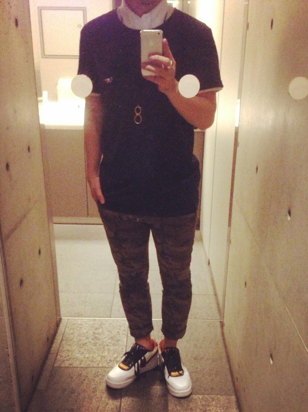 KitsuneのポケットTシャツ。形も良いし、シンプルで使い勝手も良いのでネイビー、ホワイト、グレーと三色購入。この日はネイビーで☆ ユニクロのポロシャツをインナーにしてレイヤード仕立てに。 Nike×R.Tの白スニーカー。最近お気に入りです☆