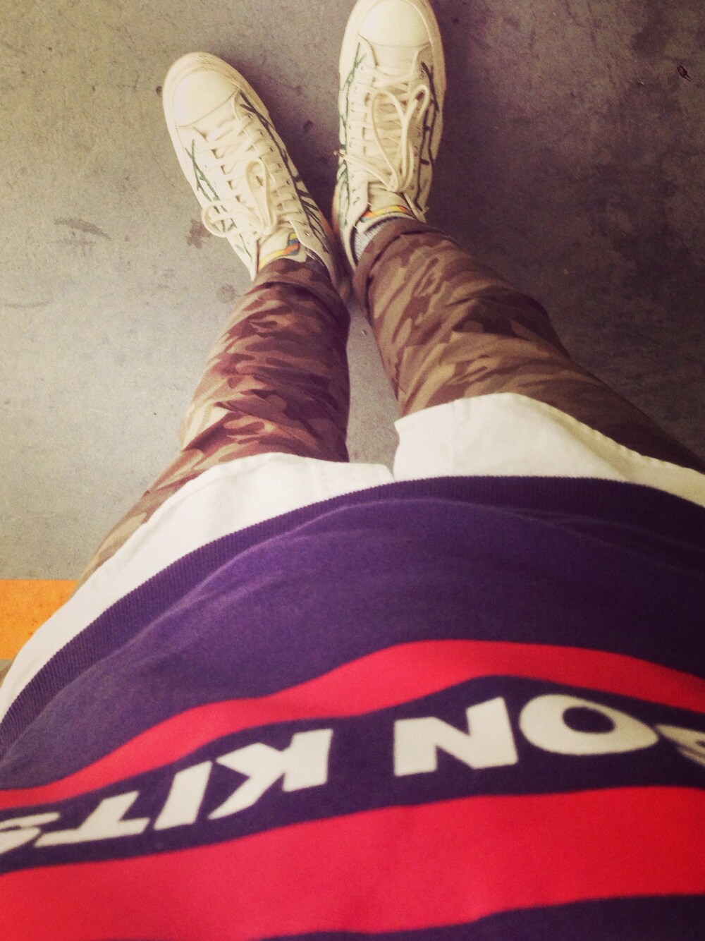 スウェット KITSUNE シャツ ユニクロ パンツ SOPHNET スニーカー visvim SOPHNETの迷彩パンツ。テーパードがいい感じに効いていてシルエットが良い☆ ネイビージャケ等と合わせたり少し外したい時にかなり使えるのでお気に入りです☆ しかし、この格好だと少し寒かった。。。 残念(´・_・`)