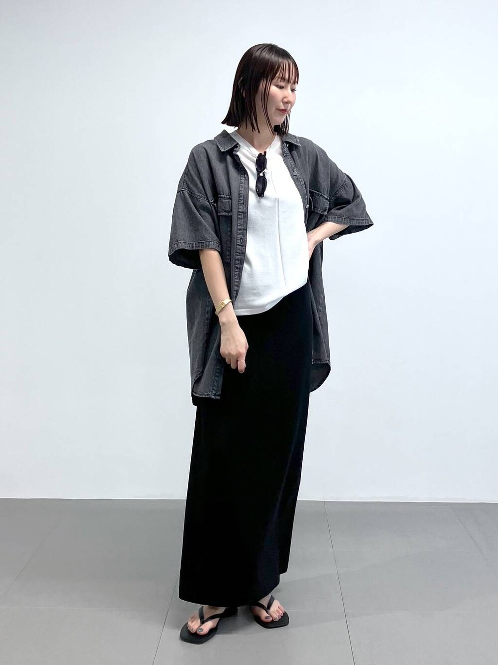 ◼︎各アイテムのおすすめポイント  ̄ ̄ ̄ ̄ ̄ ̄ ̄ ̄ ̄ ̄ ̄ ̄ ̄ ̄ ̄ ̄ ̄ 【トップス】 インナー:1枚でも様になる半袖ニット。ジャケットなどのインナーにもおすすめ。 羽織り:オーバーデニムの半袖シャツ。羽織りとしても、オーバーに着用がおすすめ。 【ボトムス】 サラッとひんやりする素材のニットスカート。 丈もしっかり長めで高身長さんにもおすすめ◎ セットアップでも着用頂けます!