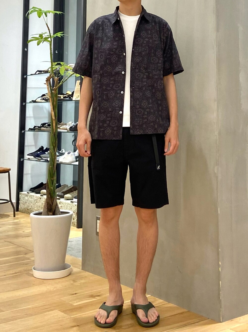 柄シャツに同色のパンツを合わせて カジュアルながら落ち着いた印象に