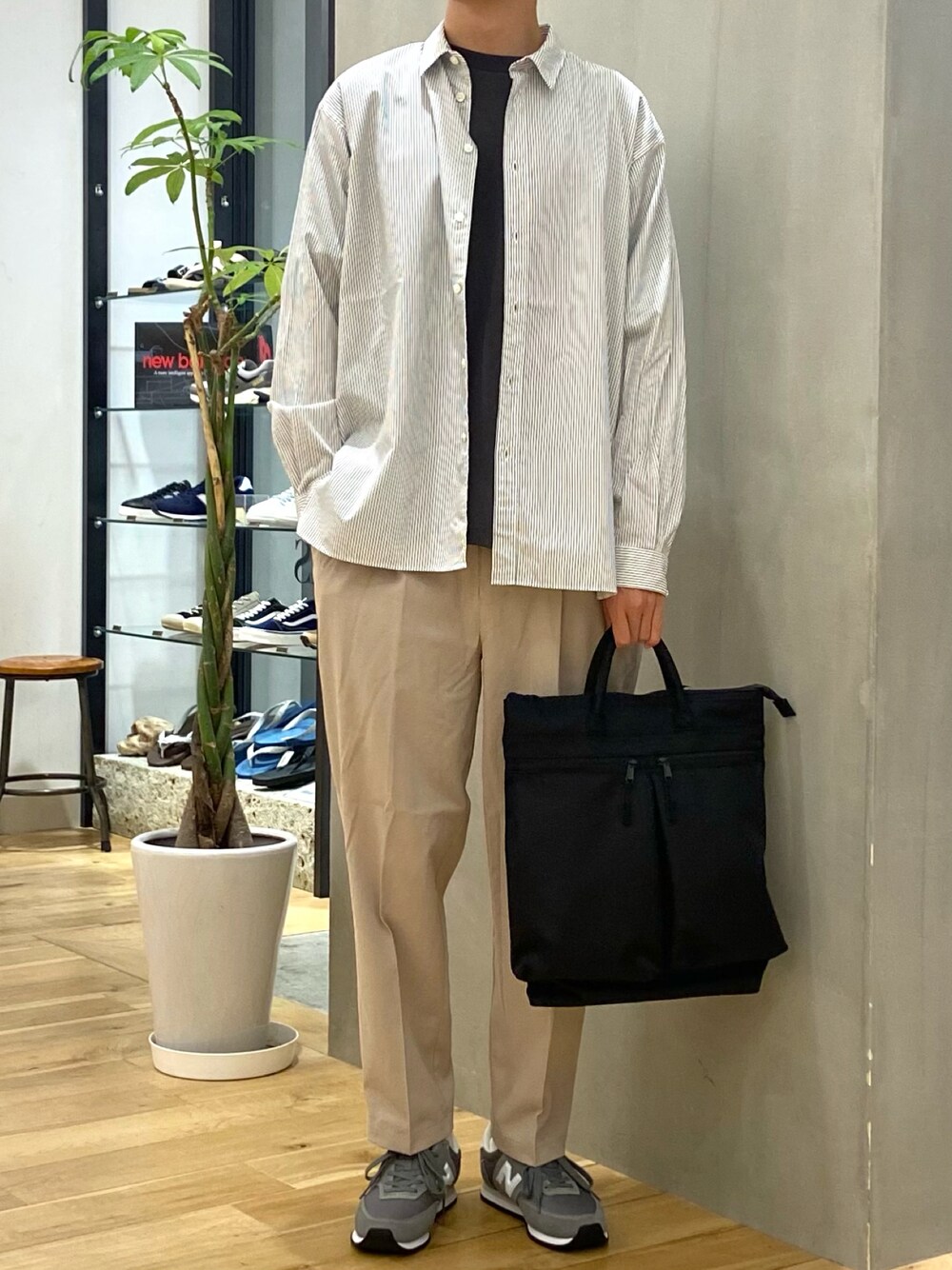 ストライプシャツで明るく爽やかな雰囲気に インナーとバッグを暗めでコーデに締まりを