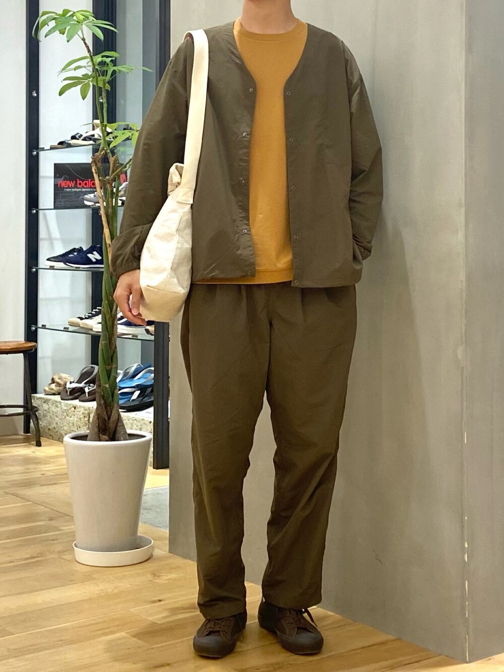 カーキ、マスタード、ブラウンで カラーを秋らしくまとめたコーデ