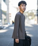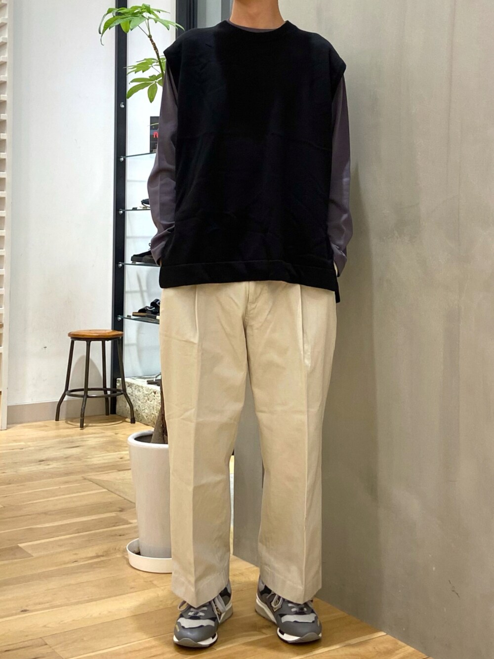 ロンTの上からニットベストで秋らしく トップスを暗めでまとめ、パンツでアクセント