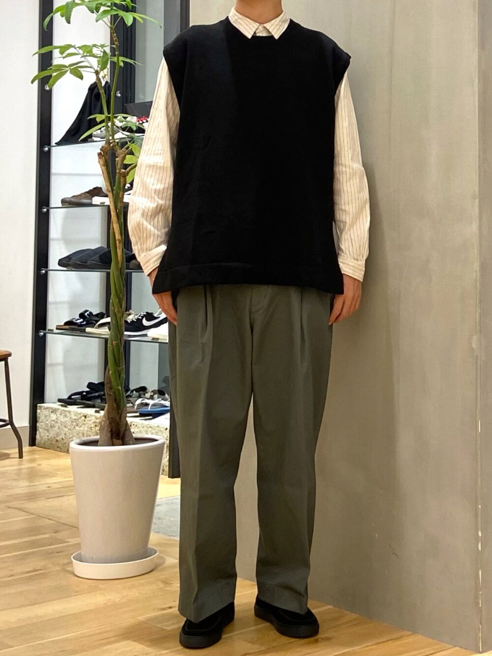 ベストとシャツのカジュアルコーデ シンプルながらストライプで柄物も