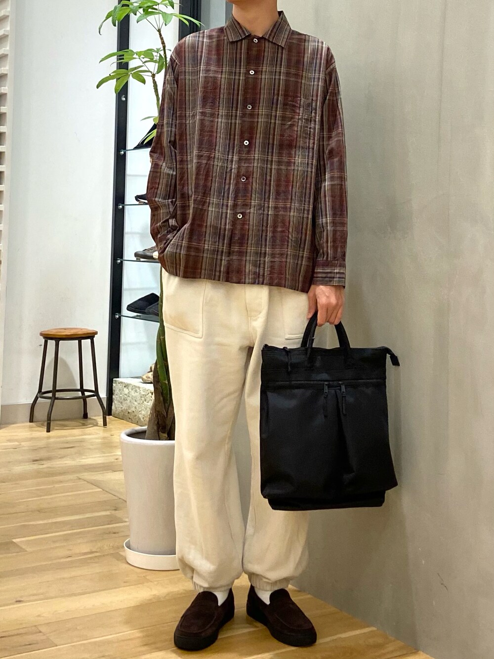 シャツとスウェットパンツのカジュアルコーデ ローファーやバッグでキレイめ要素もプラス