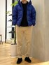 色物のダウンを使ったカジュアルコーデ 合わせるアイテムはシンプルでよりアクセントに