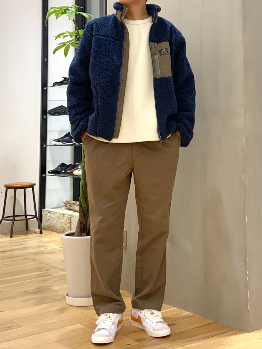 ボアの切り替えデザインのカラーをパンツで拾い まとまりのあるシンプルなコーデに