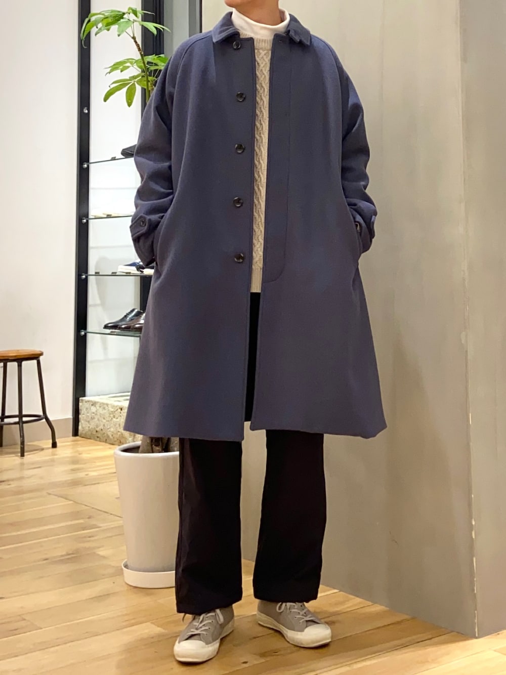 ウールアイテムにナイロンパンツを合わせて カジュアルダウンさせたゆるコーデ