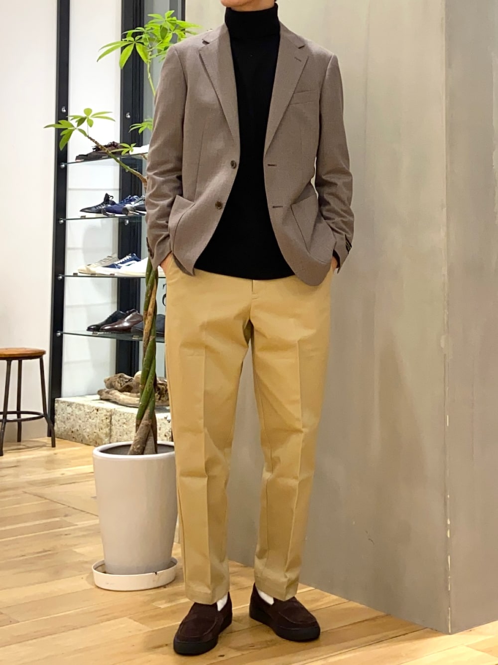 ジャケットとパンツのスタイルに タートルネックを合わせたキレイめカジュアル