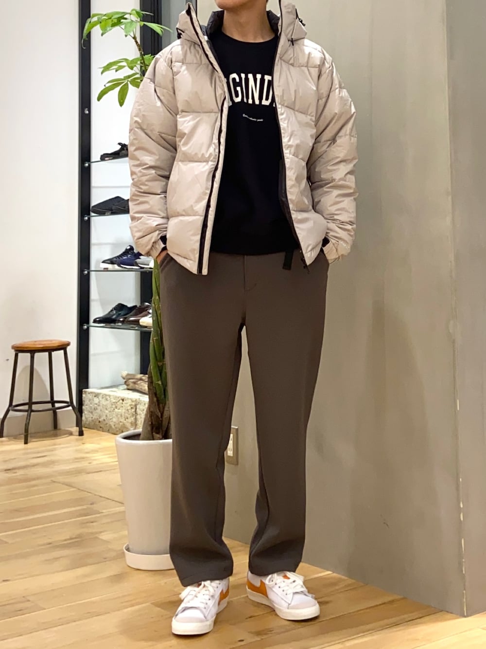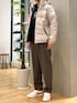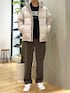 ロゴスウェットでよりカジュアルに 白ダウンで明るめな冬コーデ