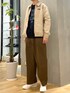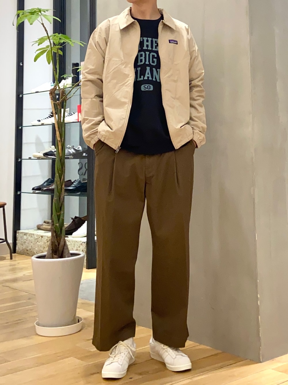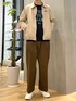 ベージュの同系色でコーデにまとまりを ロゴスウェットを入れて程よいアクセントに