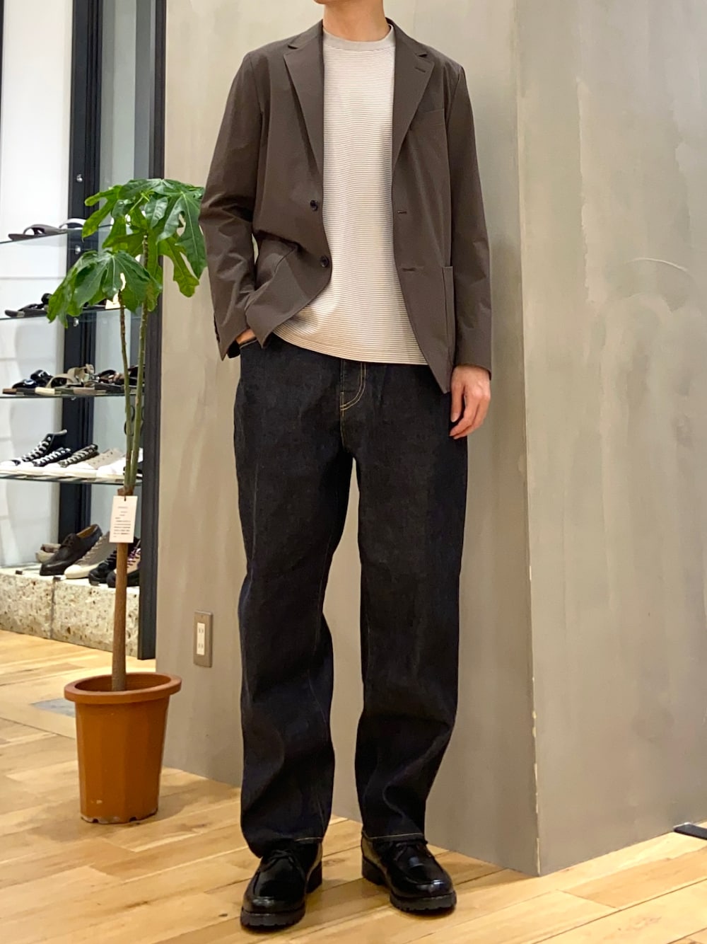 カットソーでカジュアルダウンさせた デニムを使ったジャケパンスタイル