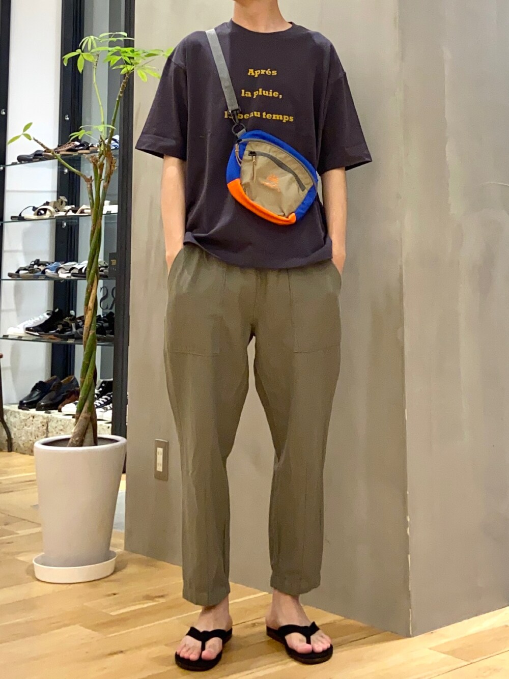 ロゴとバッグがアクセントのカジュアルコーデ カラーは少し暗めで合わせ落ち着いたトーンに