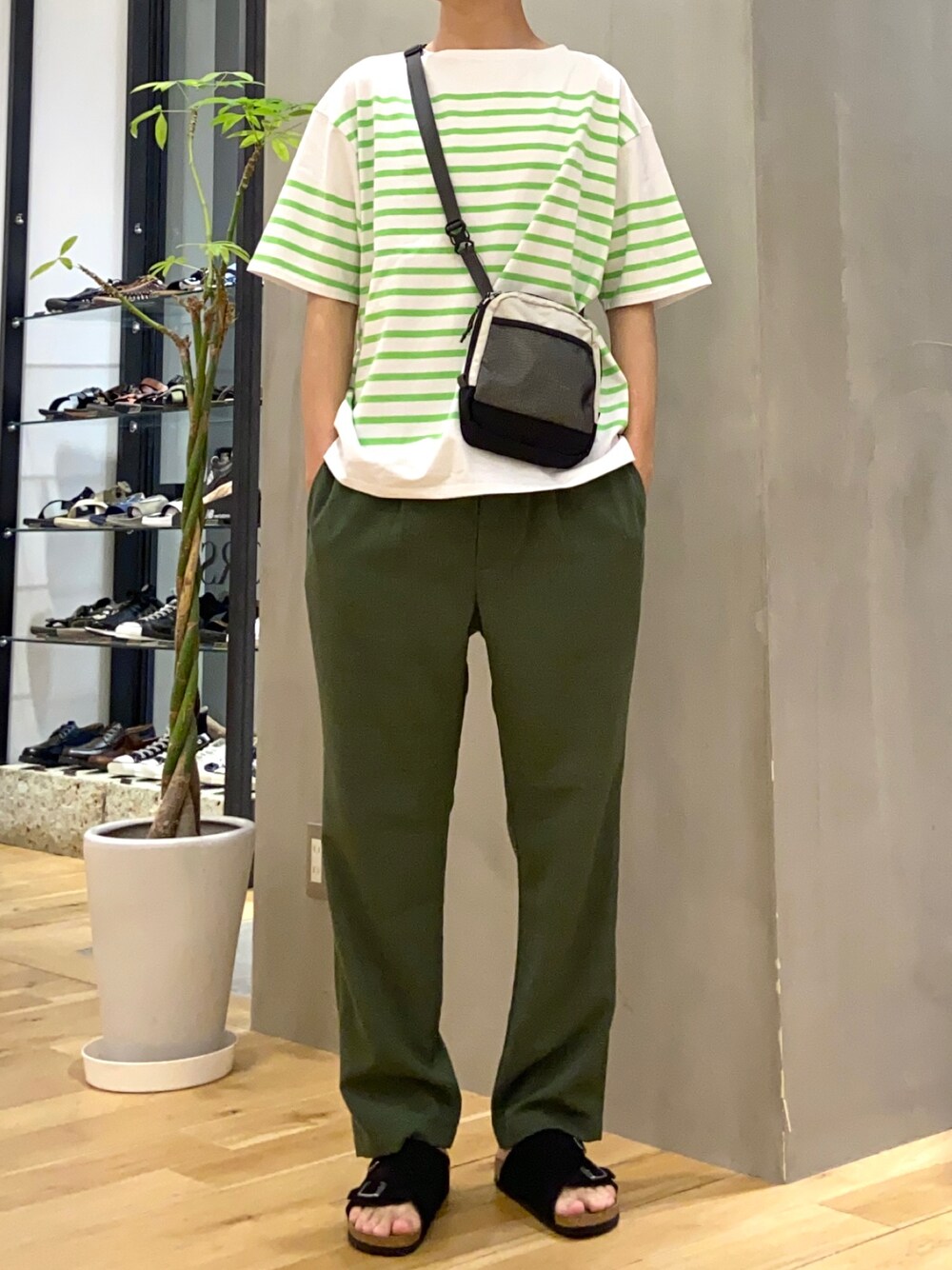同系色で合わせてまとまりとこなれ感を バスクシャツの爽やかな夏コーデ