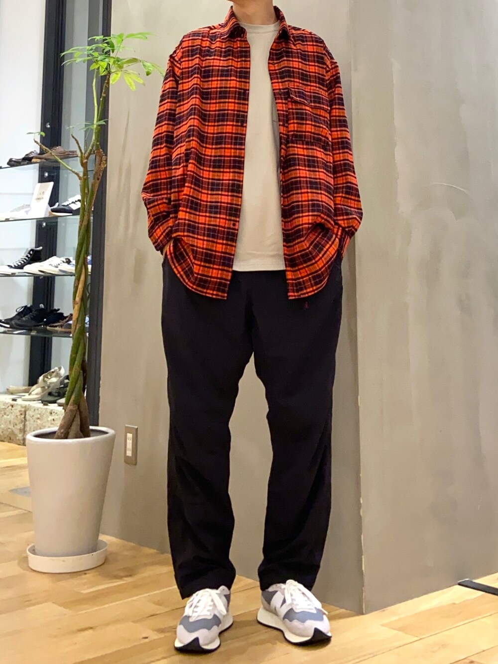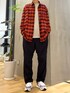 レトロ風な赤のチェックシャツをゆったり 合わせたカジュアルコーデ