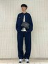 デニムのセットアップを使ったカジュアルコーディネートです。 トップスのミジンボーダーロングスリーブ Tシャツは アクセントになりすぎないデザインあるアイテムです! 1枚でもインナーとしても使えて、程よいゆとりがある のでゆったりとした着こなしもできます!