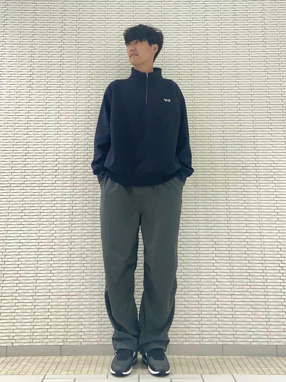 デザイン性のあるアイテムを使ったカジュアルコーディネートです。 ボトムのナイロンワッシャースノーパンツはシンプル ながらゆったりシルエットでアクセントになるアイテムです! 生地もハリがありしっかりとしていてガシガシ秋口 からお使いいただけます!