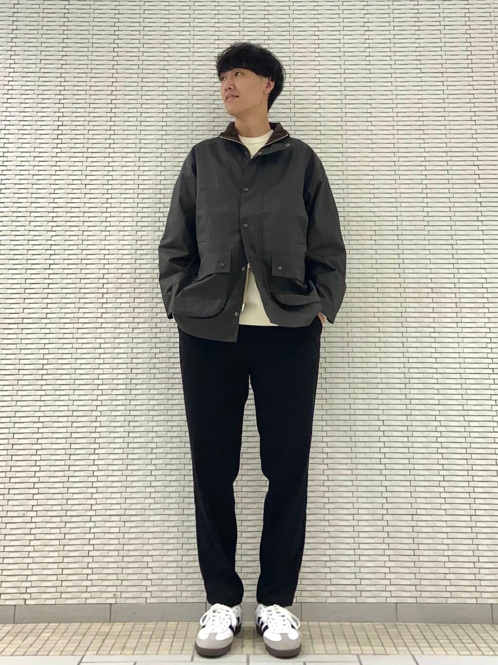 大人カジュアルに合わせた秋冬コーディネートです。 アウターのBarbour別注OS BEDALE STANDCOLLARは 全体的にゆとりあるオーバーサイズで身長182cmで サイズ38でもゆったり着こなせるアイテムです! 重厚感もありかっこいいのでシンプルに合わせても コーデが様になります!