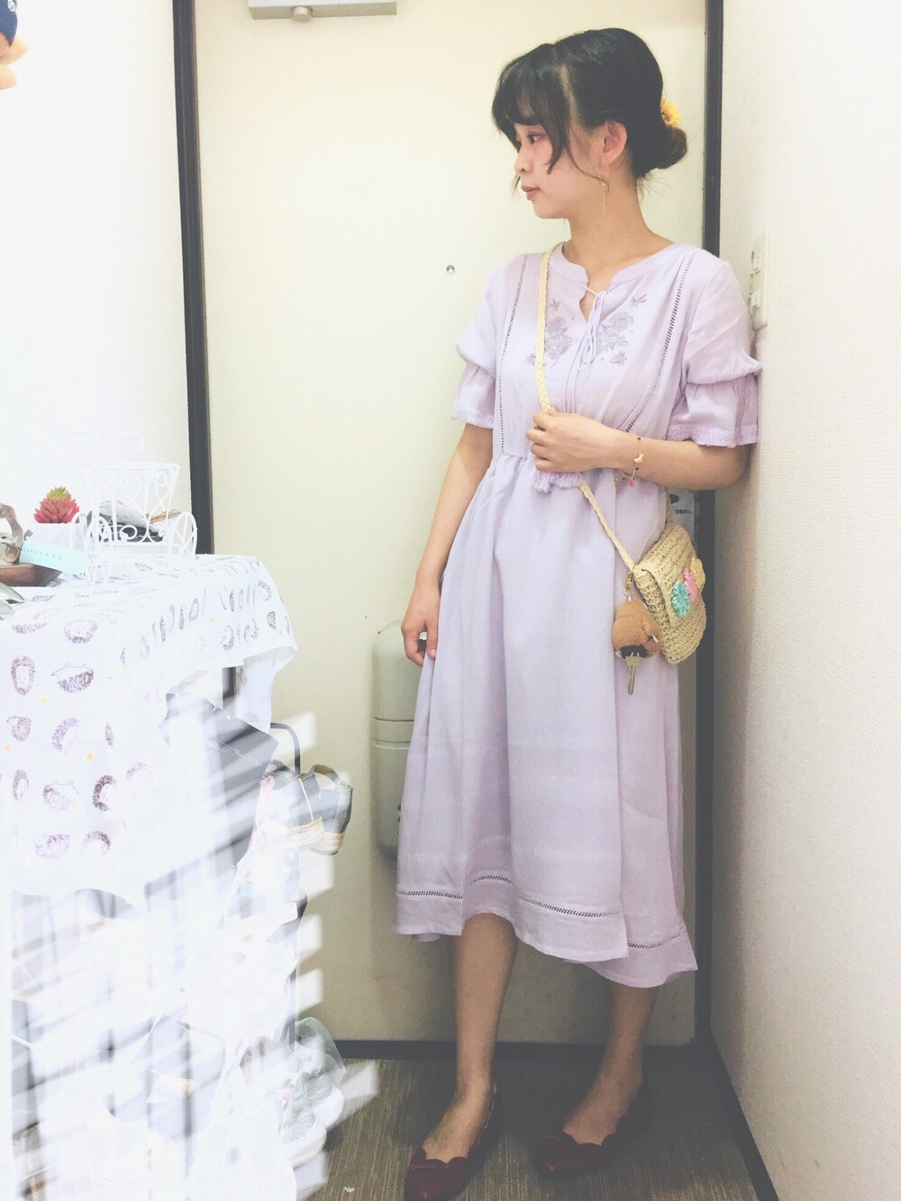 おはようございます☀ 今日はピンクムラサキのワンピースを着ていました💕 ボリュームのあるスカートで薄くで夏にぴったり! 可愛らしい花のバックで甘い夏を演出🌸
