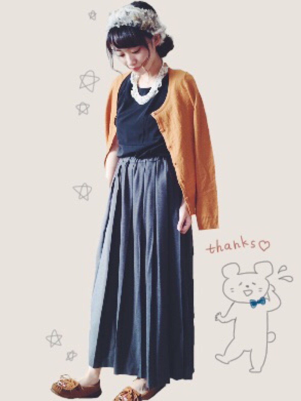 こんにちわ 〜 今日は晴れてうれしいです 朝はさむかったけど 昼はあつかったりで 何着たらいいのか 迷います ′ᴗ‵ 秋の服装がしたいけど、、 なので中途半端な コーデさんってかんじですね ! ヘアバンドのもふもふ、、、 あしたは お出かけなんで たのしみです 〜 山の上のカフェに いく予定です ⚐ バナナジュースのむのたのしみ 〜 ☀︎