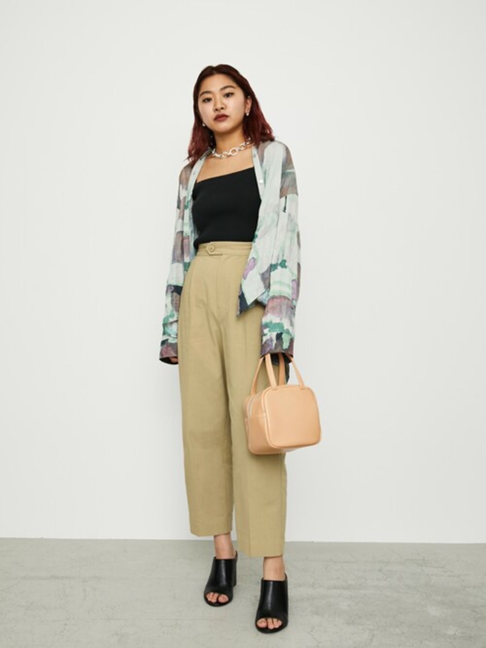 デコルテ・足首・つま先を見せることで春を楽しむコーデ。程よく足見せしてくれるミュールタイプの靴は春・夏・秋使えて万能。大きなアクセをつけてデコルテを飾りたい。スクエア型シンプルバッグはたくさん入るのに大きすぎないサイズ感で万能。