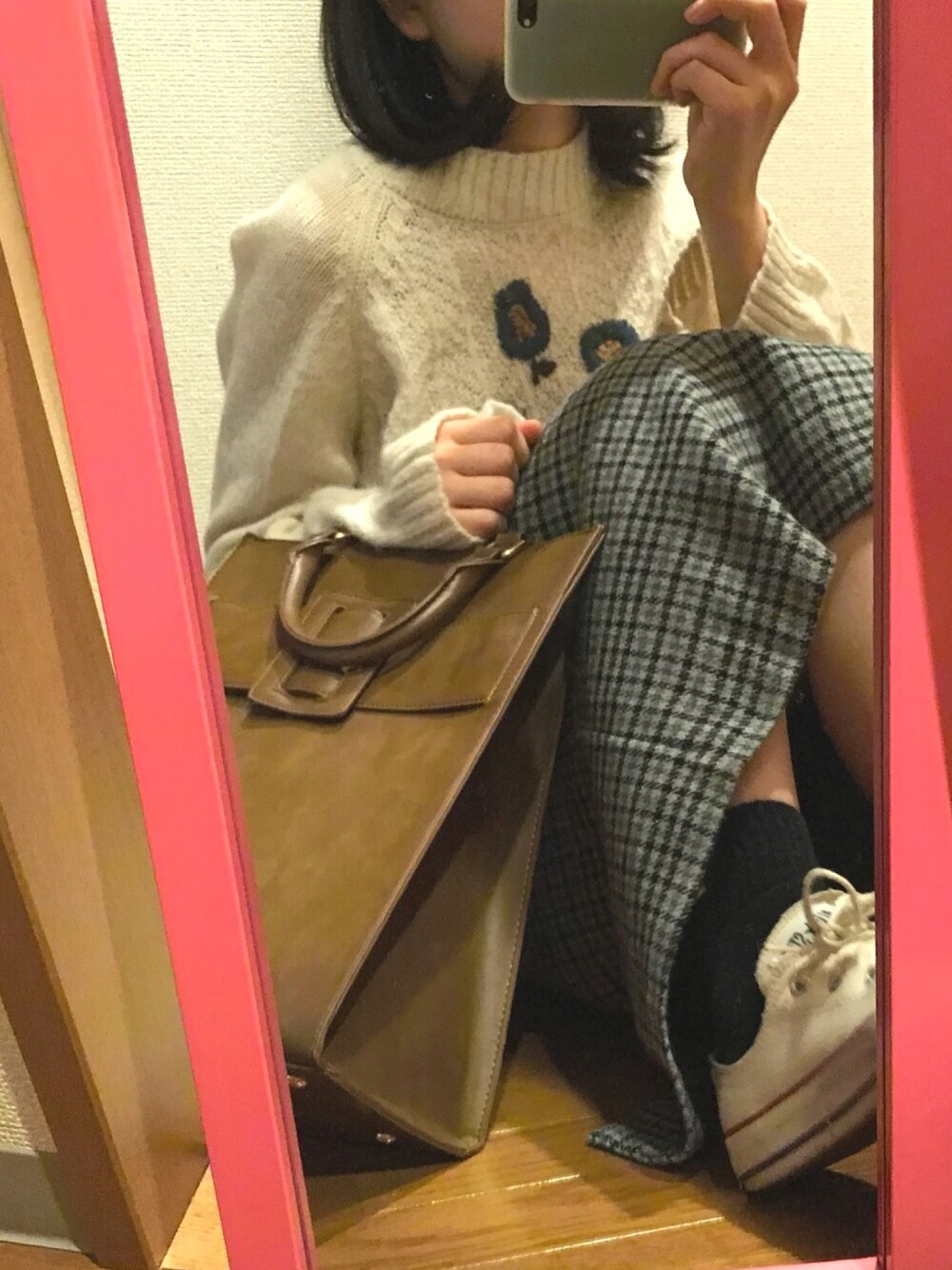 お花のニットにチェックスカートでちょっとレトロな雰囲気に。