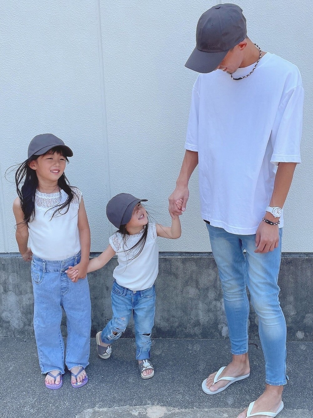 爽やかコーデ 夏でも親子でリンクコーデ キャップもお揃いです☻ 子供もサンダルはダイソーとバースデイ😁