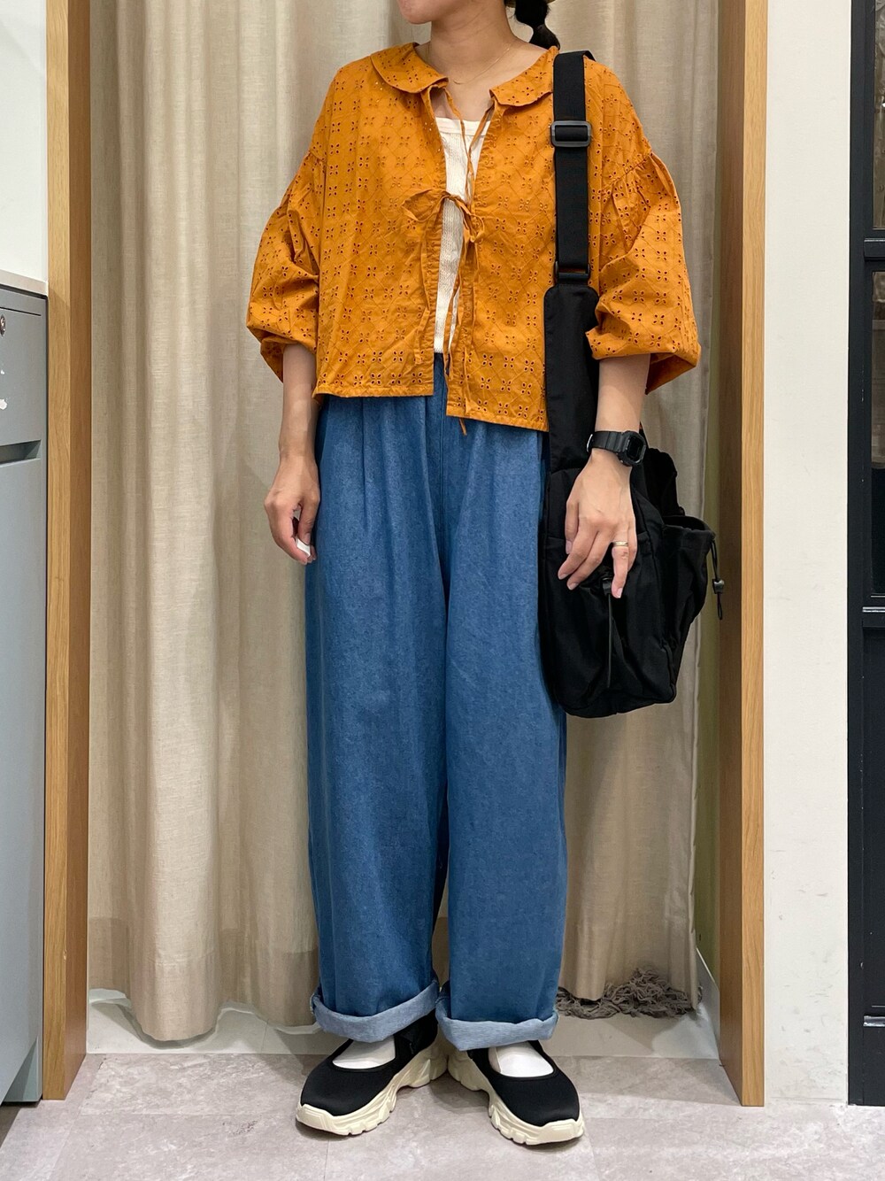 ショート丈のブラウスは長袖ですが袖捲りをすれば今からでも合わせられます◎ 中のインナーを変えれば長く使えるのも嬉しい ポイントですよね🫧 バランス良く見えるようにインナーはインしてズボンはロールアップして履いていますˎˊ˗