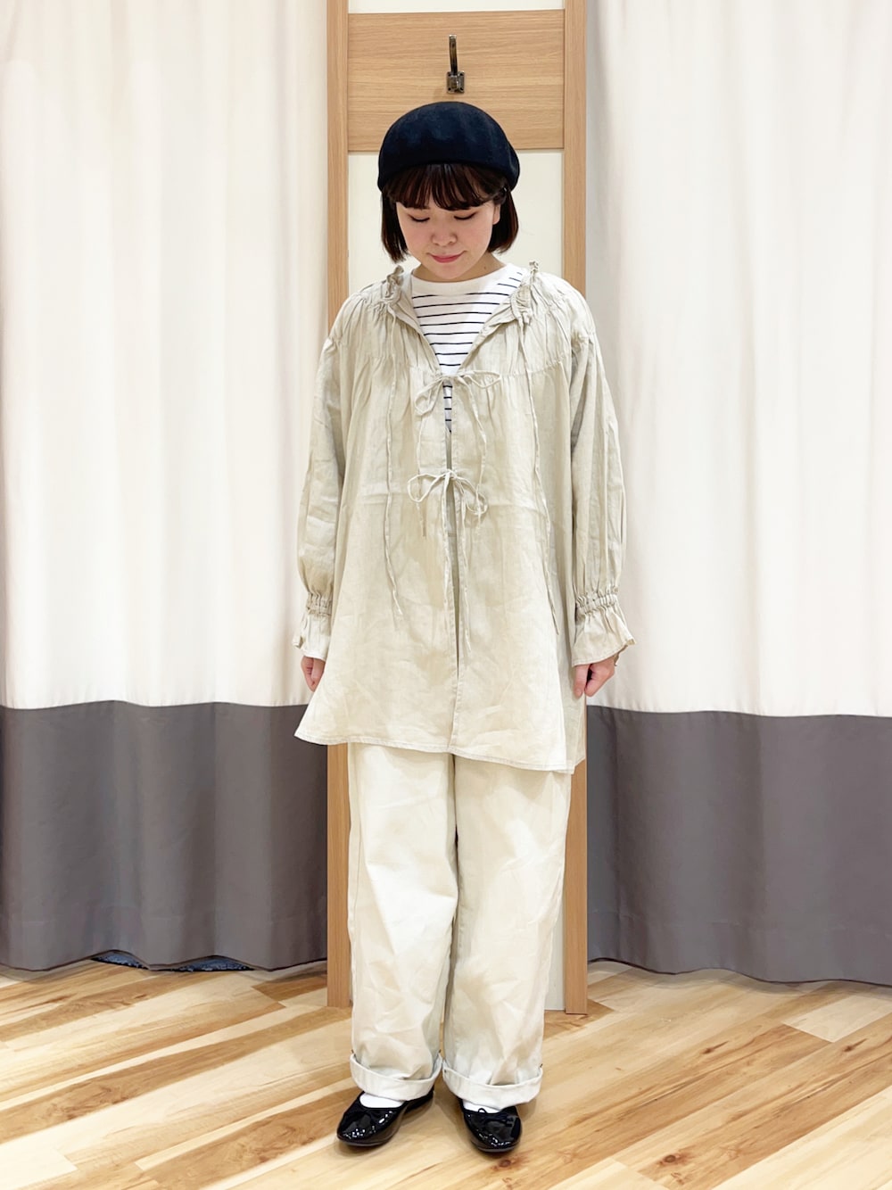 ご覧いただきありがとうございます🌷 春カタログの中でも人気な リネンチュニックのカジュアルコーデです♡ サロペットの上から羽織りとして着てみました♩ 1番上のリボンを外すと、ほどよい可愛さで着られます◎