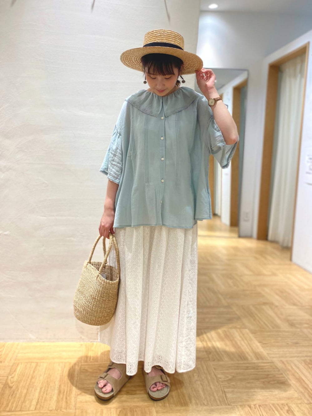 ガーリーなスカートを爽やかなミントのブラウスで合わせました! 大きめの襟で顔周りがスッキリ見えますꪔ̤̮
