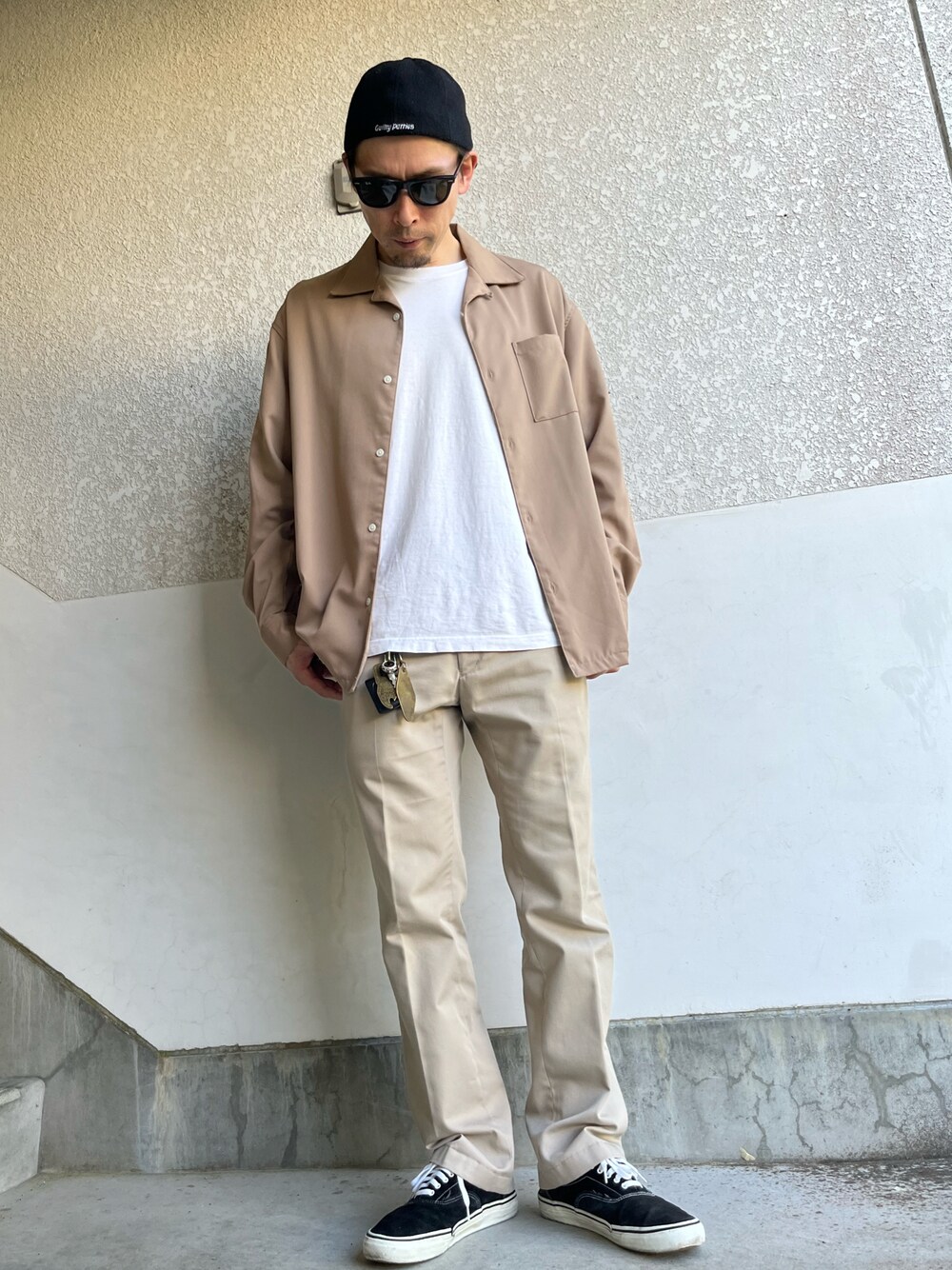 ベージュセットアップ風コーデ シンプルになりすぎないようキャップ+スニーカーで合わせてみました。