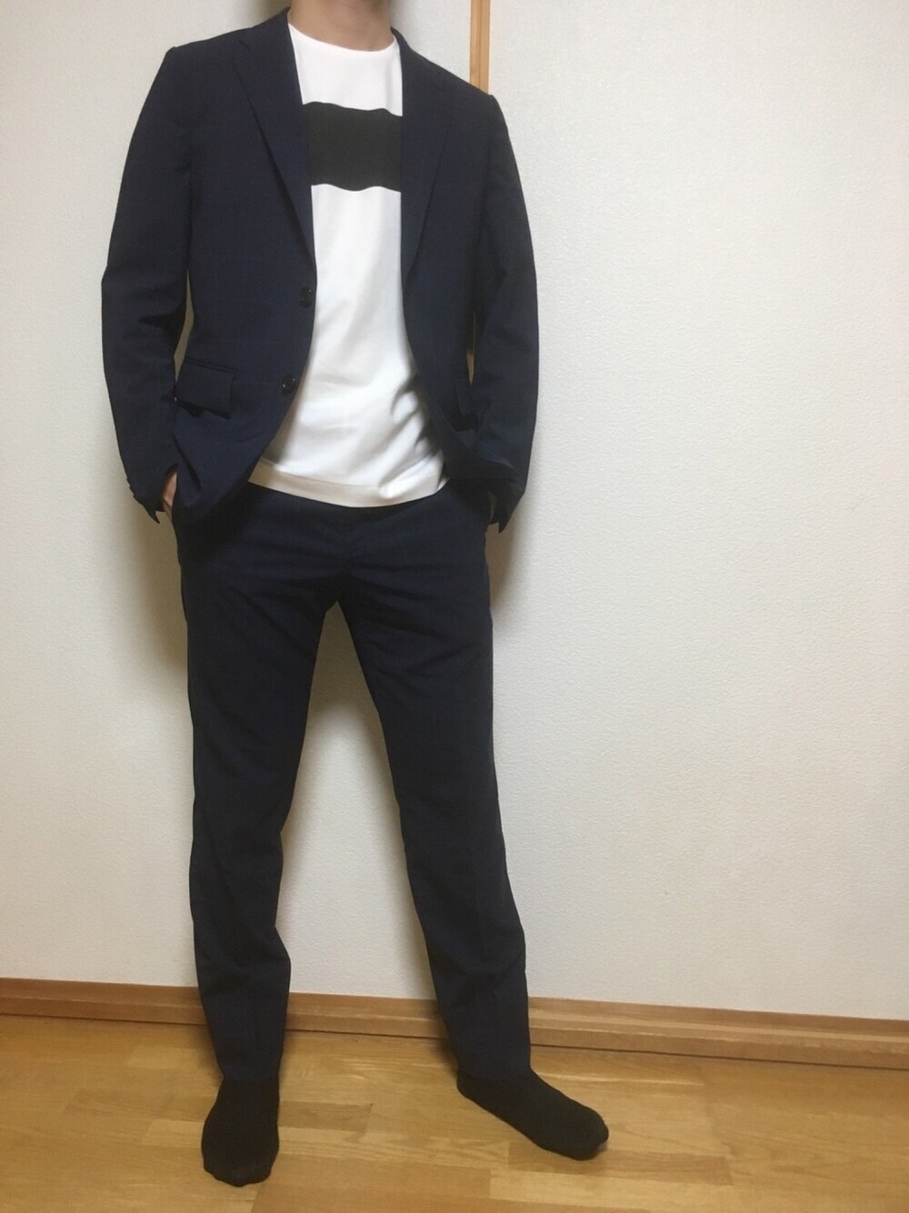 たまにはかっちり スーツジャケットコーデ これはすごくストレッチが効くので着やすいです! アダムエロペのラインTシャツも最高!!