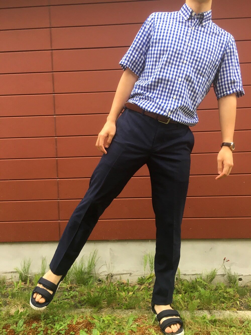 おはようございます。 トップスのギンガムチェックシャツは 昔買ったものを半袖にリメイクしたものです。 今っぽくゆったり目に袖を切ってもらっており お気に入りです! きちんと目の時にはサンダルで外すのが 好きです!