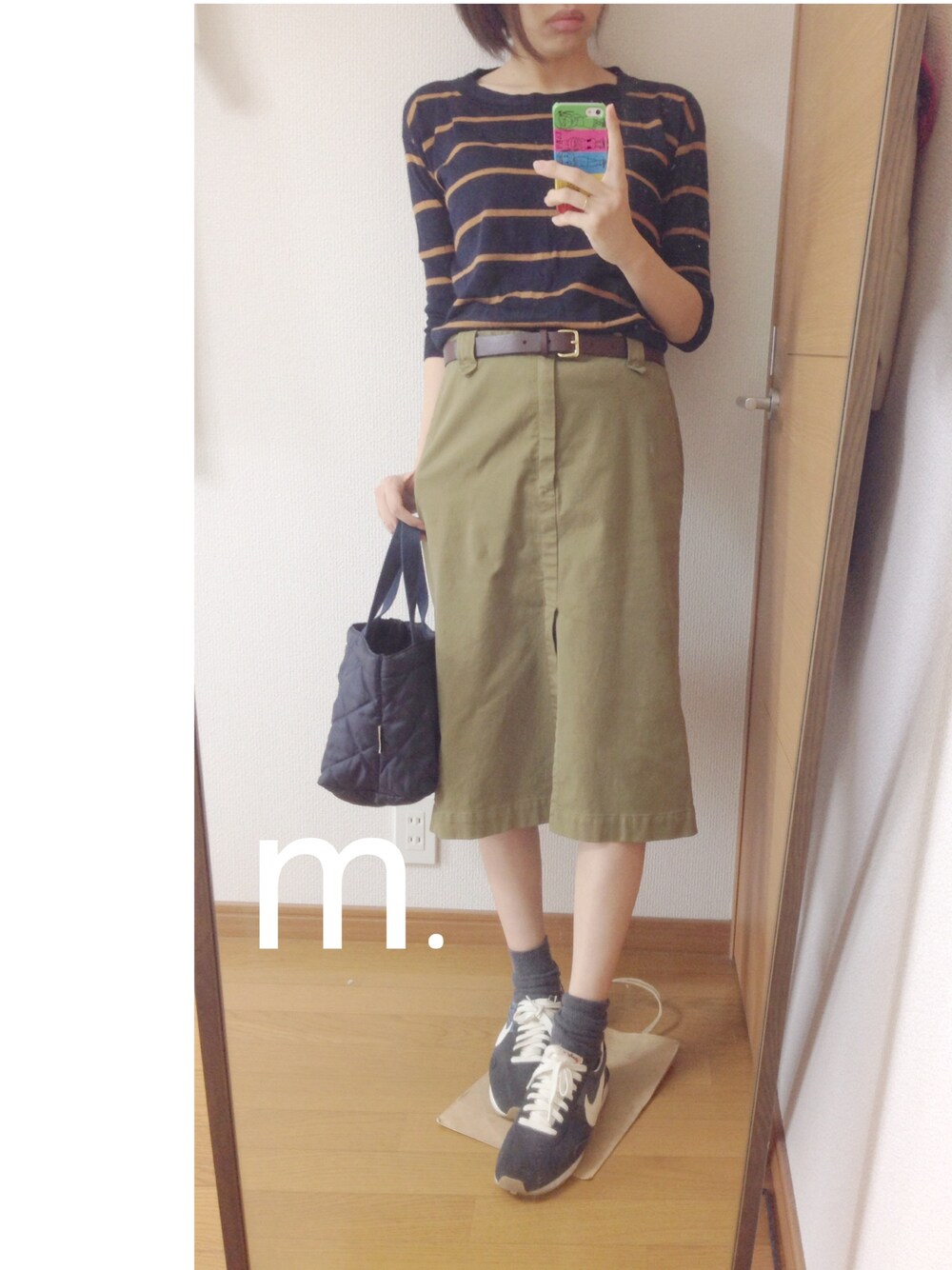 トップス…UNIQLO カーキ × ネイビー 新しいお洋服がほしいなあと思いつつ、なかなか運命のものに出会わない最近です…😥