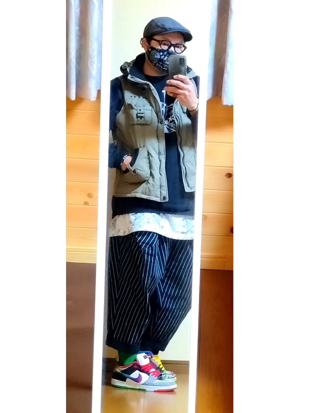 丁度、昔着ていたベストが出てきたので、端切れやら色々と組み合わせてミシンリメイク。ベストに合わせるコーデをしてみました。